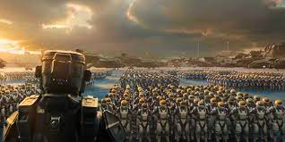 This shot is from the new series Halo and in this shot it gives the sense that there is going to be a future battle or fight. In this shot we see the character Kia looking over hundreds or thousands of soldiers with military machinery in behind them. The setting of this shot looks to be a futuristic shot that's set years in the future due to the advanced armor they have and by the advanced vehicles in the background. The color scheme of this shot gives off a light and dark theme from the dark could covering the skies and how the sun breaks through the cloud to light the army on the ground. Mise-en Scene is important to every movie. It provides the tone and theme of the movies and it gives the audience a sense of what's to come next. This shot is hinted towards a battle in the future .
