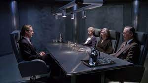 This second shot is from the movie Dead Ringers and in this shot we see what looks to be a meeting is a dark room. Mise-en scene is also represented by props and lighting and what people are wearing. This shot we see 4 people in a dark room all dressed up formal. The table looks to be set up nicely and well done with a jug and 4 cups for them. There also looks to be table decor. The mise-en Scene of this shot shows that this a important meeting with the low lighting and the dark room gives off a sense of a secret meeting