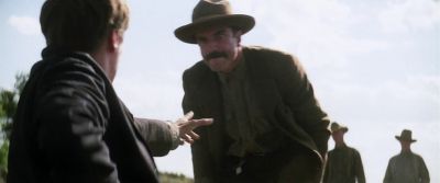 In the final shot I will be looking at is from There will be blood and in this shot we see a low over the shoulder shot. This shot shows the power that the person with the mustache and hat shows. The Mise-en scene of this shot shows the camera placement and the lighting of the sky with the power them man shows with the other on the ground with his hand up. This shot shows a sense of action or fighting these shots are used to show the power presented and that the man stands on business. This type of shot is used in many movies to show the dominance or power that someone has that they use to scare or threaten others.